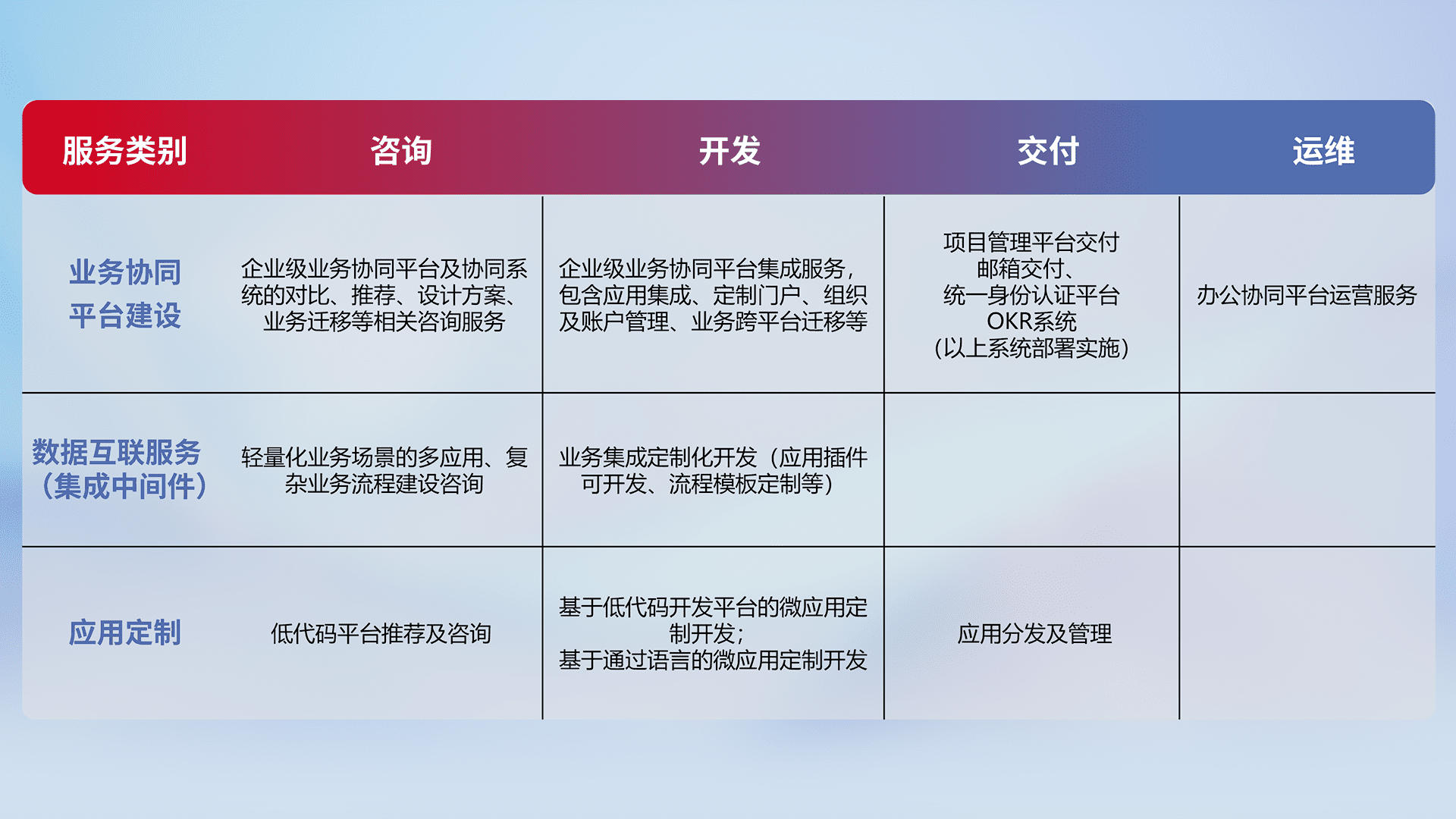 针对钉钉、、、企微、、、IDaas等平台级产品提供产品的规划、、、方案、、、交付、、、定制化开发等服务,,,,实现如统一协同办公、、、、智能客户服务、、、、混合会议管理、、、、智能数据查询、、等业务场景,,,,实现数字化转型。。